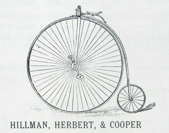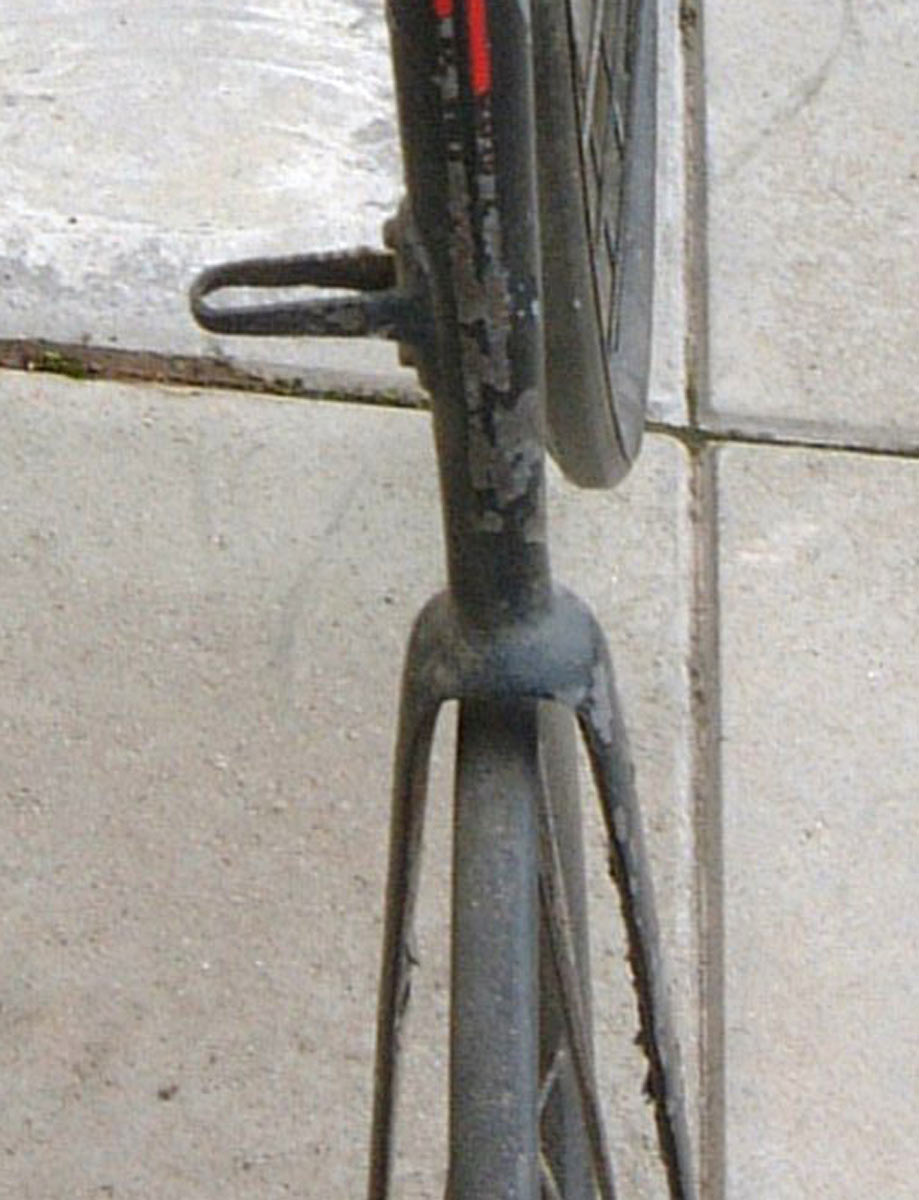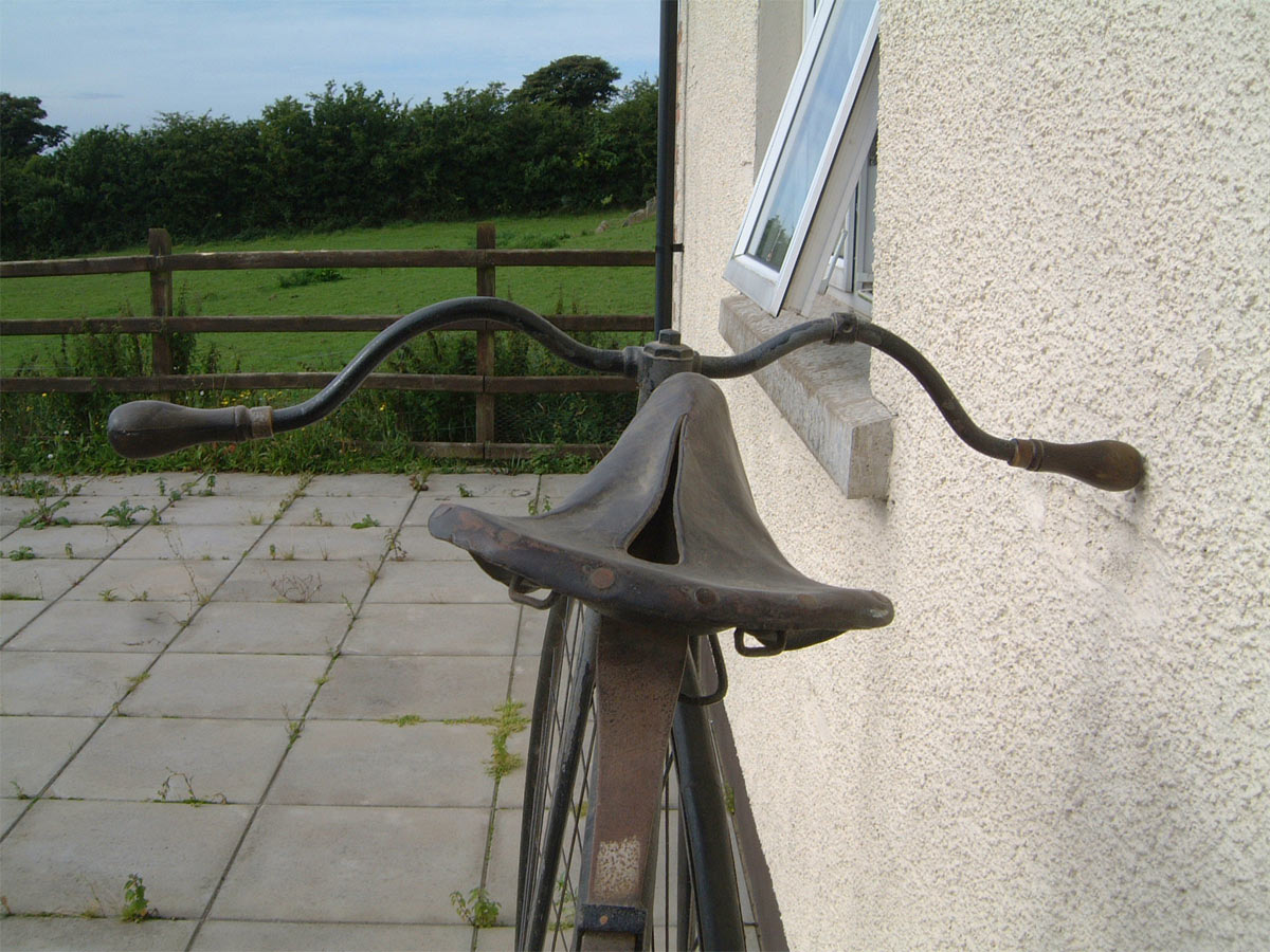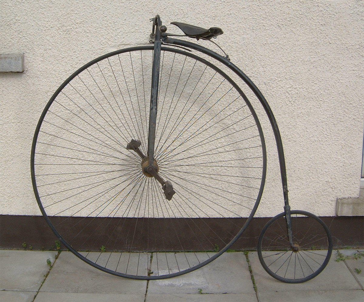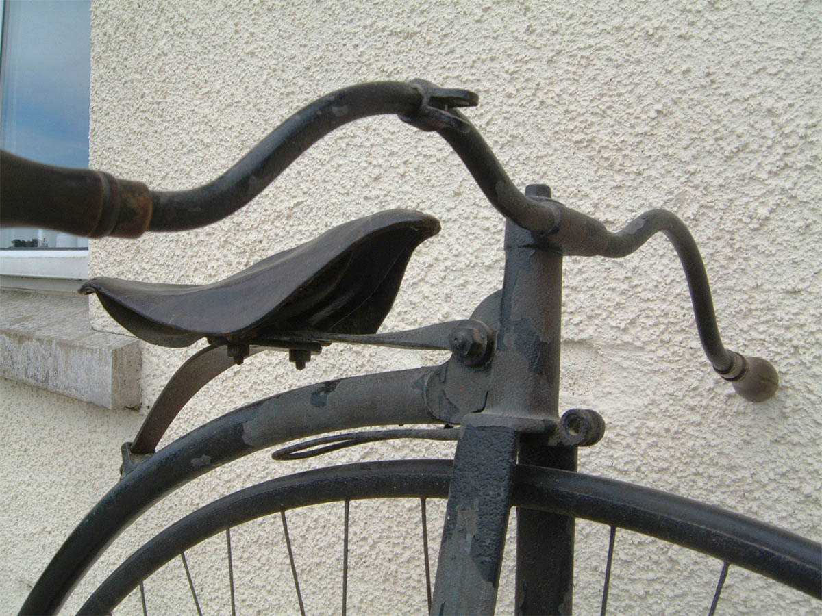 Like a lot of penny farthings, the backbone is a bit deformed, due to a heavy rider. When it was new, the backbone followed the wheel exactly. Compare it to the brochure!