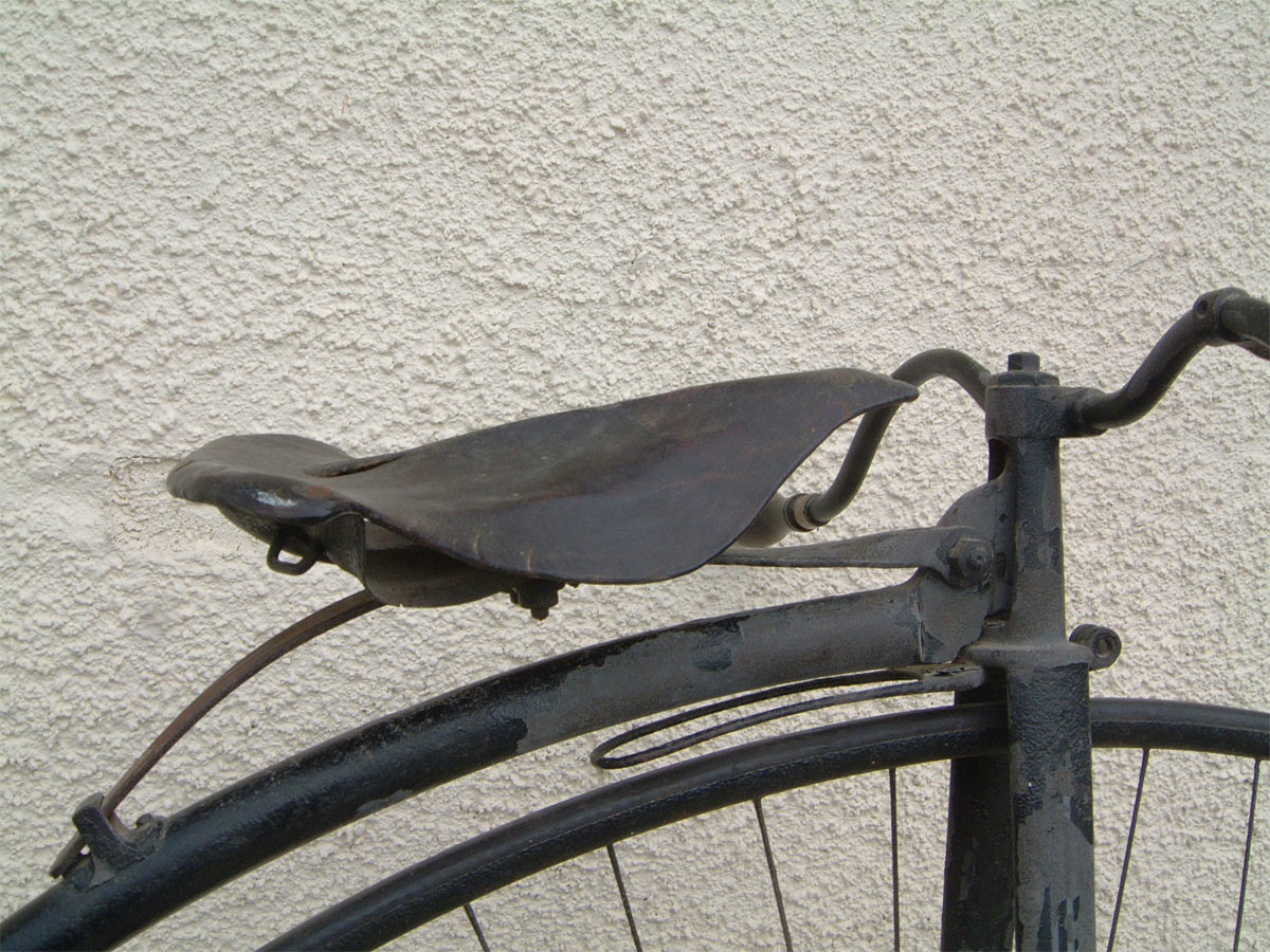 This is a beautiful survivor, although someone once spoiled it with a can of black paint and red striping. Might have been the same man who got rid of the braking mechanism. Since racers never had a brake, the would-be sportsmen often removed it. Fantastic original saddle, nice original hubs and spokes.