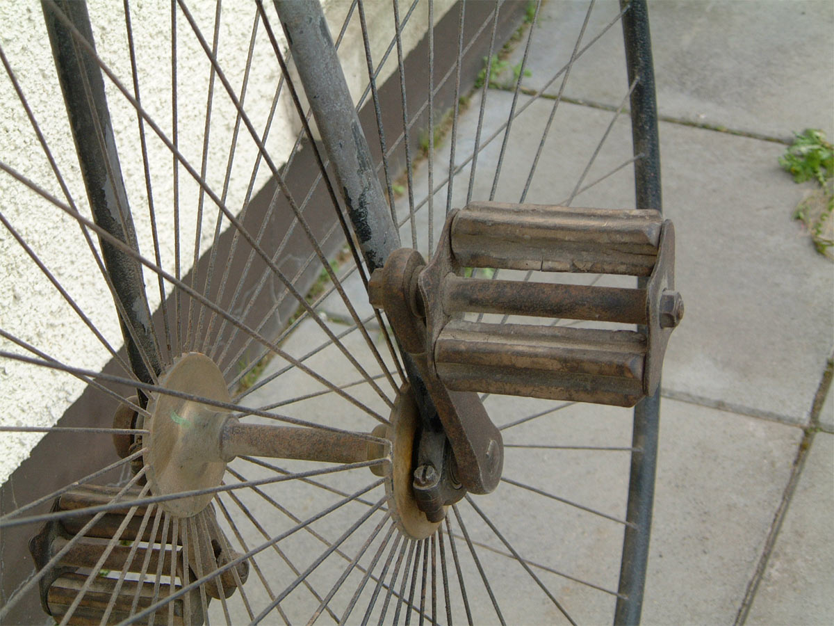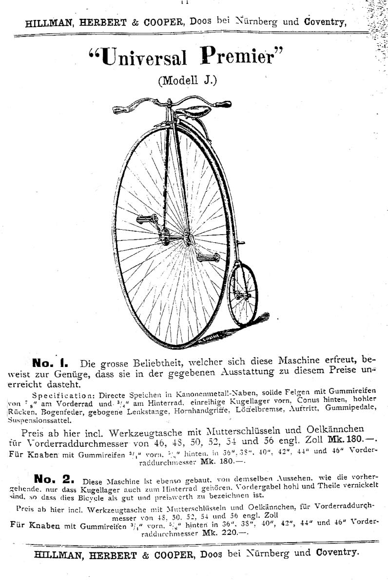 This Premier Universal has solid front and rear forks. I am not sure how old it is, I originally estimated it 1883-1885 until I got a scan of the 1888 catalogue. This (German) catalogue shows the Universal No. 1 with solid forks and cone bearing on rear wheel. Very old fashioned in 1888, but I guess it was one of the cheapest bicycles of a major maker on the market.